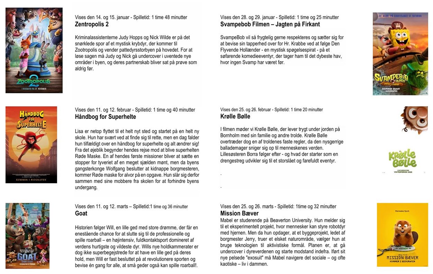 Filmene vises onsdage og torsdage i ulige uger. Om onsdagen vises filmene kl.14.00 for elever på Borup Skole i 0., 1. og 2. klasse og om torsdagen kl. 15.00 for elever på Borup Privat Skole samt eleverne fra Borup Skole i 3., 4. og 5. klasse. Vær opmærksom på at filmene begynder tidligere på dagen end hidtil.